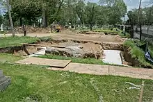 By April 1853, the entire 60 acres (240,000 m2) had been cleared of nearly all trees, and 20 acres (81,000 m2) of the site enclosed by a split-rail fence.[13] A boxwood hedge was planted along the fence.[14] Of the enclosed area, 12 acres (49,000 m2) were ready for burials. The burial area was broken down into four sections (all of them with plots laid out), and 1 mile (1.6 km) of road wound through the site.[13] A small gate was placed in the middle of the eastern side of the cemetery.[15] Wells were dug to provide water to the site.[16] Two circles were established in the cemetery. One of the smaller circles was on Main Drive near the Kinsman Avenue entrance, with another small circle to its west. A much larger circle was in the center of the cemetery, and officials intended to build a chapel there at a future date.[17] A small mausoleum-like receiving vault, Gothic Revival in design, was built just east of the Kinsman Avenue entrance.[18][lower-alpha 4]