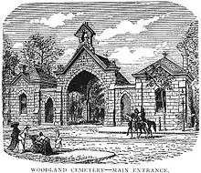 On May 18, the city council tentatively decided on the name "Woodland Cemetery" for the new burying ground[20] because of the heavily wooded nature of the land.[21][10] The name was formally adopted on June 8.[22][lower-alpha 5]