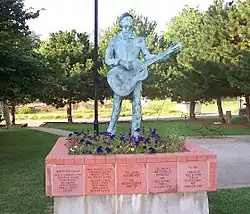 The festival, which over the years has morphed into being called "WoodyFest" by attendees,[1] was founded in 1998 and the inaugural festival included performances by Guthrie's son Arlo Guthrie, British folk-punk-rock artist Billy Bragg, Ellis Paul, Jimmy LaFave, Joel Rafael, and The Red Dirt Rangers.[3][4] For the festival's founding, the Woody Guthrie Coalition commissioned a local Creek Indian sculptor to cast a full-body bronze statue of Guthrie and his guitar, complete with the guitar's well-known inscription: "This machine kills fascists".[4] The statue, sculpted by artist Dan Brook, stands along Okemah's main street - named Broadway - in the heart of downtown Okemah.[5]