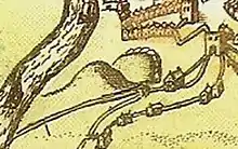 The castle nevertheless continued in use for a time, partially because the Worcestershire County gaol was situated in the outer bailey; the earliest record of this gaol is from 1221, when a porter was recorded as being employed as a gaoler.[17] The gaol appears to have been built of wood during the medieval period.[18] Escapees remained a problem; some were recorded during the 1220s, and during Second Barons' War, Worcester was captured and all the prisoners released.[19] Later in the same war, Henry III was imprisoned there for a period by Simon de Montfort.[12] The castle was also used as one of the locations for the Worcestershire county court and election of local officials.[3]