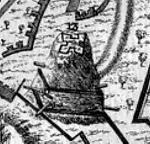 In the late 1130s a period of civil war – the Anarchy – broke out in England, in which the rival factions of King Stephen and the Empress Matilda contested the kingdom; Worcestershire proved to be a key battleground in the war.[4] The first attack on Worcester itself occurred in late 1139, when an Angevin army from Gloucestershire assaulted the city; after an attempt to take the castle on the south side of the city, the Gloucester forces entered from the north, looting and burning the city.[11] As a result, Walter de Beauchamp chose to side with Matilda.[12] Worcester became a base for Stephen's forces for a period, with Stephen replacing Walter as the constable with Waleron de Beaumont, before the city and castle were reclaimed for the Empress by Robert of Gloucester.[13] In response, Stephen first stormed and burnt the city in 1148, and then attacked it again in 1150, shortly before the end of the conflict.[14] Two neighbouring siege castles were built by Stephen as part of these operations, designed to contain Worcester Castle itself,[12] one at Henwick Hill the other at Red Hill. After the conflict, Walter was finally reaffirmed as the constable of Worcester Castle by Henry II, the Empress's son.[12]