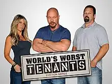 World's Worst Tenants is an American television series on Spike. It premiered on June 12, 2012.[1] The eviction specialists are Todd Howard, Rick Moore and Randye Howard. Though billed as a reality program, it does not document actual events; the show's producers admit that the program depicts "reenactments of many of the actual confrontations that Howard and his team have experienced".[2] The program does not make it clear until the closing credits that the events depicted are in fact reenactments.[3] On November 13, 2012, Spike announced that the series has been renewed for a second season which debuted on March 12, 2013.[4][5]