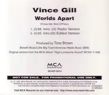 "Worlds Apart" is a song co-written and recorded by the American country music artist Vince Gill. It was released in July 1996 as the second single from the album High Lonesome Sound. The song reached number 5 on the Billboard Hot Country Singles & Tracks chart and won Gill a Grammy Award for Best Male Country Vocal Performance.[1] It was written by Gill and Bob DiPiero.