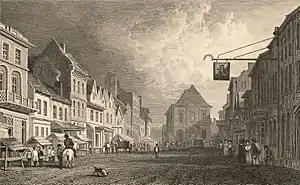 An 1831 view of Wrexham High Street with the old Town Hall in the background