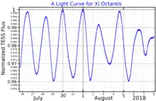 When the Hipparcos catalogue was released in 1997, Xi Octantis was found to vary in magnitude[20] — ranging from 5.32 to 5.36 based on data from the International Variable Star Index.[2] It has since been classified as a Slowly pulsating B-dwarf with a period of 1.78 days.[2]