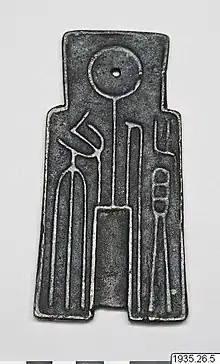 The reverse side of these charms have the "sun" (the dot) and "moon" (represented by a crescent) at the upper left area of the spade.[17] At the upper right part of these pieces are three stars that are connected by a line, these three stars refer to the Sanxing.[17] There are also two "Human (or humanoid) figures" on these charms that are of unknown origin and its not clear which people (or deities) they represent.[17] On the right foot of these spade charms there may be a heron (or an egret).[17]