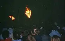Campers hearing the challenge under the flaming triangle at a closing campfire.