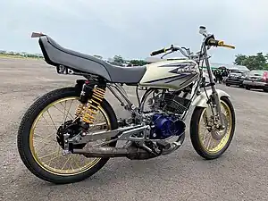 In Indonesia Yamaha RX King produced between 1983 and January 2009, so it's become legendary bike, especially in 2 stroke categories. Indonesian standard version of RX King can make 18,5 PS/9500rpm stock, with fuel efficiency around 35-40 km/liter of 88-octan premium. Because good availability of spare parts, and easy to maintain, until now RX King is one of the most wanted bike for two stroke speed lover, beside Kawasaki Ninja 150R/RR. Suzuki RGR 150, Satria 120 R or F-150, Shogun, Smash, Honda Supra X, Yamaha F1ZR Vega R, Jupiter Z, and Jupiter MX.