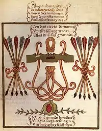 The yoke and arrows (Spanish: Yugo y flechas) or the yoke and the bundle of arrows (Spanish: Yugo y haz de flechas) is a symbolic badge dating back to the dynastic union of Spain's Catholic monarchs Ferdinand II of Aragon and Isabella I of Castile. Subsequent Catholic monarchs continued to use it on their shields to represent a united Spain and symbolize "the heroic virtues of the race".[1]