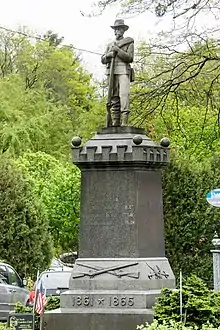 A granite monument depicting a Civil War soldier was erected in 1906 at a traffic triangle in York Village.[15] It has been suggested by some that his uniform appears to be incorrect for a Union soldier, as he wears a brimmed fedora and goatee; some local tour guides claim that the uniform is actually Confederate.[15] Another explanation is that either the sculptor, Englishman Frederick Barnicoat, or designer John Staples, mistakenly depicted a uniform from the time of the Spanish–American War.[15] It is also possible that the 20th Maine Volunteer Infantry Regiment did wear a similar uniform.[15]
