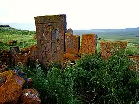 The memorial is located in the mountains 8 kilometres (5.0 mi) south-east of the ruins of the fortified Urartian settlement of Teyseba, also known as Odzaberd and near the modern-day village of Tsovinar. Geographically it is located at the south-east corner of Lake Sevan, which can be seen in the distance at a highpoint amongst the ruins of Khrber where the memorial lies within. There are a number of medieval khachkars, headstones, and tombs in Khrber. The oldest graves are located at the base of a hill just south of the ruins.[1]