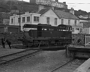 ![]() After working a freight train from Cork, one of CIÉ's 121 class diesel locomotives is turned on the turntable at the east end of Youghal station in March 1975 | |