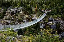 The Yukon Suspension Bridge is a pedestrian cable suspension bridge located on mile 46.5 on the South Klondike Highway in Northern British Columbia, Canada. It is 200 ft (60.96 metres) long and stretches 57 ft (17.36 metres) over the Tutshi River Canyon. There is an admission charge, and it is visited by over 25,000 people every summer between the months of May and September.