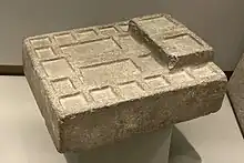 These yupana, made of stone, have 18 triangular compartments. On one side there is a rectangular tower with one level and three triangular compartments. In the central part there are four square compartments.[2]