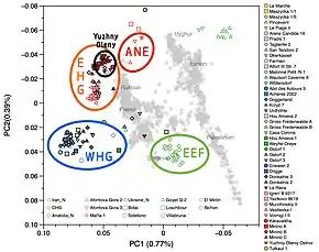 Remains of Eastern Hunter-Gatherers dated to circa 8,100 BP (6,100 BCE) have been excavated at Yuzhny Oleny.[2] A total of 19 Eastern Hunter-Gatherer genomes were extracted from Yuzhny Oleny, which had comparable or lower WHG ancestry compared to other EHG groups.[3] The Ancient North Eurasian (ANE) ancestry is the main component of the Yuzhny Oleny group, and is particularly high among them compared to the rest of the Eastern Hunter-Gatherers (EHG).[4] The 11 ka Sidelkino individual from Samara in western Russia also had a virtually identical profile with the members of the Yuzhniy Oleniy group.[3] The genes of the Yuzhny Oleni were transmitted to the people of the Yamnaya Culture, and to Scandinavia through a western route.[4]