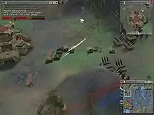 The gameplay is based around fast-paced battle action without resource gathering.[14] Winning the game requires speed and sound blitzkrieg tactics. The main aim is to gain territory by securing a sector after touching a flag.[4] Each mission begins with an introduction that includes a discussion of the goals and a preview across a sweeping landscape, briefly revealing geographical features and approaches to some strategically important flag locations. The more territory a player gains, the greater the number of units that may be built and provides more land for the construction of buildings. Unoccupied buildings that are neutral are owned with control of the sector. Each flag has a number between 1 and 5 depicted upon it.[10] The number represents a multiplier for the amount of credits a player will draw from that territory, each minute, when captured. Credits are used at factory buildings and research facilities to construct robots.