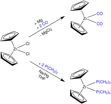 One option is the usage of π-acceptor ligands like carbon monoxide. Furthermore, a reaction with trimethylphosphine yields Cp2ZrII-complex as illustrated below.[2]