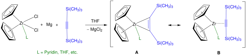 If bis(trimethylsilyl)acetylene is used instead of n-butyllithium, a higher yield is can be obtained. In this case, zirconocene complexes are synthesized to Rosenthal's reagent, represented by the resonance structures A and B. This reagent is stable at room temperature, can be stored under an inert atmosphere and allows a more precise control over the stoichiometry of reactions as it can be formed quantitatively.[5] A fine tune of the general reaction shown below is feasible by using different substituted cyclopentadienyl ligands as well as additional ligands (e. g. THF, pyridine). Instead of zirconium used as central atom, an analogous reaction with titanium is possible, too.[6]