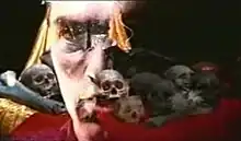 Steve Perry's face superimposed over a bed of skulls, one of many surreal images from the 1998 "Zoot Suit Riot" video.