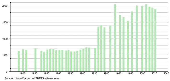 L'évolution du nombre d'habitants est connue à travers les recensements de la population effectués dans la commune depuis 1793. Pour les communes de moins de 10 000 habitants, une enquête de recensement portant sur toute la population est réalisée tous les cinq ans, les populations légales des années intermédiaires étant quant à elles estimées par interpolation ou extrapolation[28]. Pour la commune, le premier recensement exhaustif entrant dans le cadre du nouveau dispositif a été réalisé en 2006[29].