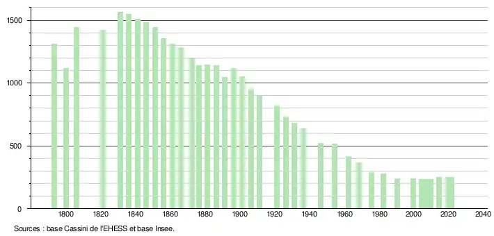 L'évolution du nombre d'habitants est connue à travers les recensements de la population effectués dans la commune depuis 1793. Pour les communes de moins de 10 000 habitants, une enquête de recensement portant sur toute la population est réalisée tous les cinq ans, les populations légales des années intermédiaires étant quant à elles estimées par interpolation ou extrapolation[16]. Pour la commune, le premier recensement exhaustif entrant dans le cadre du nouveau dispositif a été réalisé en 2004[17].