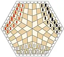 Les joueurs se positionnent de façon à avoir une case blanche sur leur droite, comme dans un jeu classique. Le placement des pièces est alors conforme au jeu d'échecs traditionnel à la différence près que la reine est toujours à la gauche du roi. La règle « reine sur sa propre couleur » n’est donc plus applicable (d'autant plus qu'il y a une reine rouge). On remarque qu'alors les trois rois sont toujours sur une case noire et les trois reines sur une case blanche.
