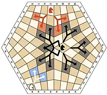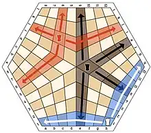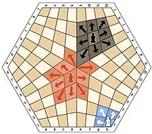 En l'absence de prise, nous remarquons que les quatre pions de droite sont destinés à faire leur promotion dans le camp adverse situé à leur droite et les quatre pions de gauche destinés à effectuer leur promotion dans celui de gauche. La destination de la promotion peut cependant changer si, au cours de sa marche, le pion prend un pion ou une pièce.