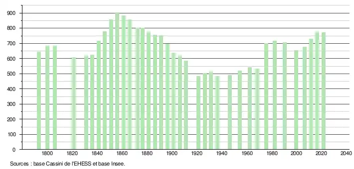 L'évolution du nombre d'habitants est connue à travers les recensements de la population effectués dans la commune depuis 1793. Pour les communes de moins de 10 000 habitants, une enquête de recensement portant sur toute la population est réalisée tous les cinq ans, les populations légales des années intermédiaires étant quant à elles estimées par interpolation ou extrapolation[20]. Pour la commune, le premier recensement exhaustif entrant dans le cadre du nouveau dispositif a été réalisé en 2006[21].