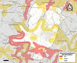 Les mouvements de terrains susceptibles de se produire sur la commune sont des tassements différentiels[26]. Le retrait-gonflement des sols argileux est susceptible d'engendrer des dommages importants aux bâtiments en cas d’alternance de périodes de sécheresse et de pluie[27]. 32,9 % de la superficie communale est en aléa moyen ou fort (54,9 % au niveau départemental et 48,5 % au niveau national)[Carte 2]. Depuis le , en application de la loi ELAN, différentes contraintes s'imposent aux vendeurs, maîtres d'ouvrages ou constructeurs de biens situés dans une zone classée en aléa moyen ou fort[Note 3],[28].