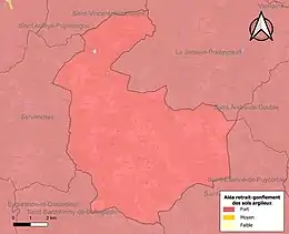 Les mouvements de terrains susceptibles de se produire sur la commune sont des tassements différentiels[38]. Le retrait-gonflement des sols argileux est susceptible d'engendrer des dommages importants aux bâtiments en cas d’alternance de périodes de sécheresse et de pluie[39]. 99,9 % de la superficie communale est en aléa moyen ou fort (58,6 % au niveau départemental et 48,5 % au niveau national métropolitain)[Carte 4]. Depuis le , en application de la loi ÉLAN, différentes contraintes s'imposent aux vendeurs, maîtres d'ouvrages ou constructeurs de biens situés dans une zone classée en aléa moyen ou fort[Note 6],[40].