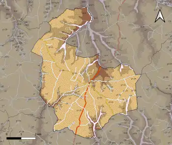 L'occupation des sols de la commune, telle qu'elle ressort de la base de données européenne d’occupation biophysique des sols Corine Land Cover (CLC), est marquée par l'importance des forêts et milieux semi-naturels (66,6 % en 2018), en augmentation par rapport à 1990 (64,5 %). La répartition détaillée en 2018 est la suivante : forêts (60,4 %), zones agricoles hétérogènes (17,9 %), prairies (9,5 %), milieux à végétation arbustive et/ou herbacée (6,2 %), terres arables (3,9 %), zones urbanisées (1,3 %), eaux continentales[Note 5] (0,7 %)[32]. L'évolution de l’occupation des sols de la commune et de ses infrastructures peut être observée sur les différentes représentations cartographiques du territoire : la carte de Cassini (XVIIIe siècle), la carte d'état-major (1820-1866) et les cartes ou photos aériennes de l'IGN pour la période actuelle (1950 à aujourd'hui)[Carte 3].