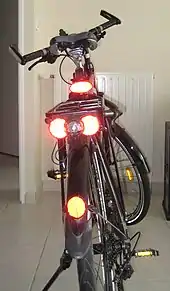 Un vélo circulant de nuit ou par visibilité insuffisante (brouillard, orage ou temps très nuageux, passage dans un tunnel...) doit avoir allumé un phare émettant une lumière blanche ou jaune vers l'avant ainsi qu'une lampe émettant une lumière rouge vers l'arrière. Le feu de position avant blanc ou jaune doit émettre une lumière fixe, c'est-à-dire non clignotante[6], le feu de position arrière peut être fixe ou à intensité variable (clignotant)[7], en France, selon le code de la route.
