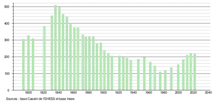 L'évolution du nombre d'habitants est connue à travers les recensements de la population effectués dans la commune depuis 1793. Pour les communes de moins de 10 000 habitants, une enquête de recensement portant sur toute la population est réalisée tous les cinq ans, les populations légales des années intermédiaires étant quant à elles estimées par interpolation ou extrapolation[14]. Pour la commune, le premier recensement exhaustif entrant dans le cadre du nouveau dispositif a été réalisé en 2006[15].