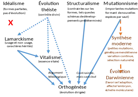 Si des explications variées de l'évolution, telles que le vitalisme, le catastrophisme et le structuralisme ont été proposées au cours du XIXe siècle, quatre alternatives importantes à la sélection naturelle étaient proposées vers 1900. L'évolution théistique prônait l'idée que Dieu pilotait directement l'évolution ; le néo-lamarckisme exposait que l'évolution était dirigée par la transmission des caractères acquis durant la vie de l'individu ; l'orthogenèse postulait que les organismes étaient affectés par des forces internes ou des lois qui dirigeaient l'évolution dans un sens particulier ; le mutationnisme affirmait que l'évolution était largement due à des mutations importantes, créant de nouvelles espèces ou formes en une seule génération.
