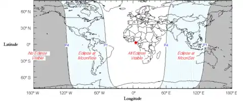 L'éclipse fut visible en totalité en Afrique, en Europe et au Moyen-Orient. Elle fut visible pendant le lever de la Lune en Asie et à l'Ouest de l'Australie, et pendant le coucher de la Lune aux Amériques.