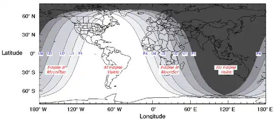 L'éclipse est entièrement visible depuis la majeure partie de l'Amérique du Nord et l'entièreté de l'Amérique du Sud. Elle est visible au lever de la Lune depuis le nord-ouest de l'Amérique du Nord et de l'Océan pacifique, et au coucher de la Lune depuis l'Afrique et l'Europe.