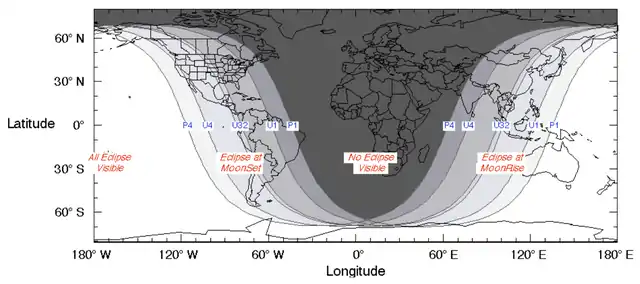 L'éclipse est visible depuis une majeure partie de l'océan Pacifique qui est tourné vers la Lune lors de cette éclipse. Une partie de l’Asie du Sud-Ouest, toute l’Australie et l’Océanie ; la majeure partie de l’Alaska, du Canada et des États-Unis assistent à l’éclipse. Ainsi que Hawaï, Mexico et l’Amérique Centrale ; et que la majeure partie de l’Amérique du Sud.