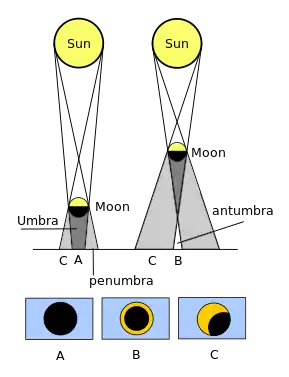 Le diagramme de droite montre l'alignement du Soleil, de la Terre et de la Lune pendant une éclipse solaire (les distances et les tailles respectives ne sont pas à l'échelle). La région gris foncé sous la Lune est l'ombre, où le Soleil est complètement obscurci. La petite zone où l'ombre touche la surface terrestre est l'endroit où une éclipse totale peut être observée. La plus grande région gris clair est la pénombre, dans laquelle seule une éclipse partielle peut être observée.