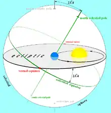 L'écliptique est incliné par rapport au plan de l’équateur céleste d’un angle appelé inclinaison de l'écliptique et valant environ 23° 26′ 10″ au 1er janvier 2024 ; cet angle exprime l’inclinaison de l’axe de rotation de la Terre sur elle-même, par rapport à une normale de l’écliptique. Quant au plan orbital de la Lune, son inclinaison varie de 5° 01′ 01″ à 5° 17′ 35″ par rapport à l’écliptique, avec une moyenne de 5° 08′ 48″.