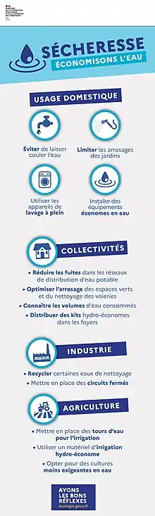 Infographie réalisée par le ministère français de la transition écologique et de la cohésion des territoires pour expliquer les principaux moyens d'économiser l'eau.