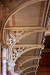 Le préau est traité sur deux niveaux parcourus sur les quatre côtés d’une coursive métallique. Les parois et le plafond sont dominés par la brique et le métal, utilisés de manière décorative. Le plafond laisse apparaître les poutres maîtresses, finement sculptées, et les chevrons d’acier séparés par des briques de couleur crème qui supportent l’étage. Déposée sur un appareillage de briques de couleur, la galerie est soutenue par des consoles et une balustrade en acier à motifs de feuilles. Les murs de la cage d’escalier sont percés de baies en gradins à pilastres et linteaux de pierres sculptées. De belles balustrades à motifs courbes sur trumeaux garnis de sgraffites atténuent son apparente austérité.
