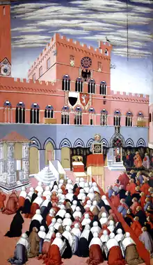 On doit au frère de Pietro, Ambrogio Lorenzetti, la fresque des Effets du bon et du mauvais gouvernement peinte, dans la salle des Neufs du Palazzo Pubblico (1337-1339), première œuvre civile, non plus seulement religieuse, mais politique et presque laïque de la peinture italienne. Ces images sont capitales par leur thème et par le traitement qui en est proposé : Ambrogio utilise le thème iconographique de la figure trônante et triomphante, souvent utilisée pour l'imagerie religieuse, mais consacre un mur entier aux Effets du Bon Gouvernement ; cette surface, clairement articulée, grâce à l'enceinte fortifiée de la cité dont les édifices font allusion à la Sienne réelle, laisse éclater le modernisme de sa conception picturale : ni histoire, ni anecdotes, des images concrètement symboliques et un espace « objectif », parcourable, où le lieu architectural n'est pas simplement « signifié », mais « représenté », et où l'espace n'est pas centré sur les figures humaines saisies, comme chez Giotto, au moment culminant de leur action et de leur expression. Avec un mélange de vérité et de symbolisme, avec des personnages à la fois concrets, particularisé et emblématiques, cette fresque est à la fois une condensation du sentiment civique siennois et une œuvre qui, par ses structures mentales et figuratives, annonce les développements de la grande peinture politique[2].