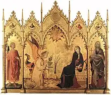 Divers peintres se succèdent dans la seconde moitié du XIVe siècle qui développent les modèles de Simone Martini et des Lorenzetti, comme l'enlumineur Niccolò di ser Sozzo (Assunta del Caleffo bianco aux Archives d'État)[11] ou Luca di Tommè (polyptyque de Sant 'Anna Metterza) qui ont signé ensemble le polyptyque de la Vierge et l'enfant entre les saints Jean-Baptiste,Thomas, Benoît et Stephane, daté de 1362.