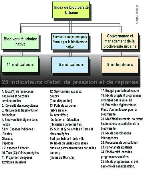 Paris a par exemple introduit dans son Plan local d'urbanisme (PLU) la notion de « Coefficient de biotope » qui dépasse le nombre de mètres carrés d'espaces verts par habitant, l'indicateur le plus utilisé, en introduisant aussi des critères de qualité écologique des espaces.