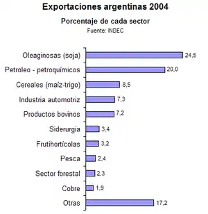Grâce à la politique du péso faible qui permet de produire des biens et des services à des prix compétitifs sur le marché international, certains secteurs d'activité argentins ont commencé à refleurir après la crise[33]. Les fortes exportations du secteur agricole ont grandement contribué au rétablissement de la balance commerciale.