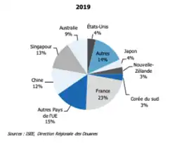 La Chine maintient sa place de premier client du territoire en 2019 en comptabilisant plus de 55% du total exporté, soit une part de marché multipliée par quatre en dix ans (13% en 2009). Les exportations vers la Chine sont d’une valeur de 99,7 milliards XPF (€830 millions).