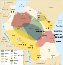 Aujourd'hui encore la santé de l'économie tanzanienne se mesure à l'aune de celle de son secteur agricole. Celui-ci emploie encore une majorité de la population active et touche plus ou moins directement de larges portions des autres secteurs économiques du pays. En 2004, le secteur primaire concentrait près de 51 % des gains en devises, 75 % des emplois, et 47 % du PNB[34]. L'abandon du modèle socialiste a permis le retour de petites exploitations familiales (essentiellement de subsistance), à côté desquelles cohabitent de large domaines commerciaux dont la production est tout entière vouée à l'export.