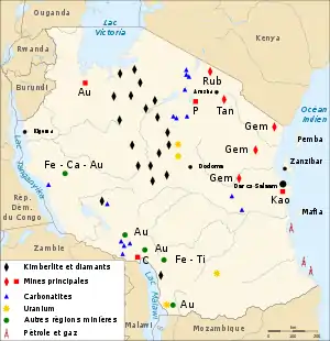 La Tanzanie dispose d'un sous-sol relativement riche et, surtout, encore largement sous - voire non exploité : métaux pauvres (fer, nickel) et nobles (or), diamants et pierres précieuses (dont certaines, telle la tanzanite, ne sont trouvées que dans la région), charbon, uranium, ainsi que divers minerais industriels comme le kaolin, le gypse ou les phosphates. Des dépôts de gaz, pétrole et cobalt ont également été repérés.