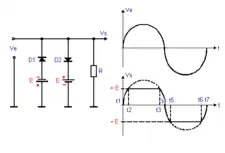 L'écrêtage consiste à supprimer une partie de l'amplitude d'un signal[1]. Le redressement supprimant les alternances négatives peut être considéré comme un cas particulier de l'écrêtage.