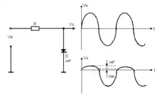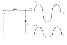 Suivant le sens de branchement de la diode, on supprime soit l'alternance positive, soit l'alternance négative. L'amplitude résiduelle de l'alternance est d'autant plus faible que la résistance de la diode est petite par rapport à la résistance R (diviseur de tension) et que la tension de seuil Vdo est faible. La résistance R ne peut pas être trop grande à cause de l'atténuation du signal. La caractéristique de la diode n'est pas parfaitement linéaire, d'où déformation du signal écrêté. On doit tenir compte du fait que, pour les hautes fréquences, la capacité de la diode constitue avec la résistance R un circuit intégrateur.